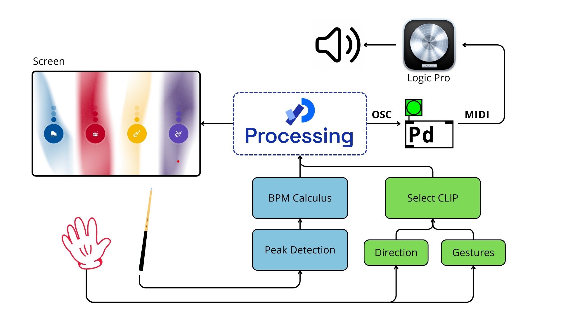 The baton detects beat motion and vibrates to confirm a successful hit. All data is processed in real time through Teensy, sent to Processing for visuals, and translated into audio commands in Pure Data. It even talks to a DAW using MIDI.